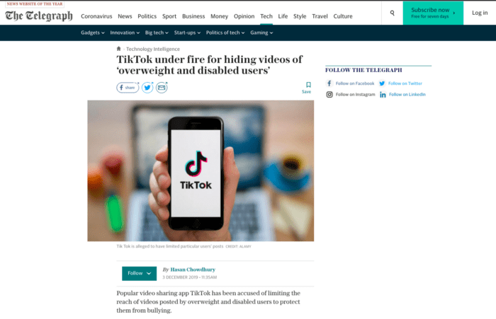 Chowdhury, Hasan. “TikTok under Fire for Hiding Videos of ‘Overweight and Disabled Users.’” The Telegraph, 3 Dec. 2019. www.telegraph.co.uk, https://www.telegraph.co.uk/technology/2019/12/03/tiktok-fire-hiding-videos-overweight-disabled-users/.