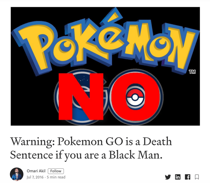 Akil, Omari. “Warning: Pokemon GO Is a Death Sentence If You Are a Black Man.” Medium, 13 July 2016, https://medium.com/mobile-lifestyle/warning-pokemon-go-is-a-death-sentence-if-you-are-a-black-man-acacb4bdae7f.