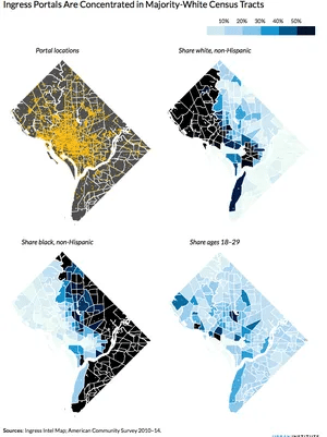 [T]he locations of pokéstops and gyms are taken from the locations of ‘portals’ in Niantic’s previous augmented-reality GPS-based game, Ingress. And Ingress’s portals, while not available as an exportable list, are viewable on a world map, making it possible to compare city demographics to the distribution of Ingress portals.