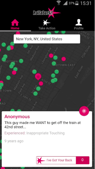 Hollaback! is a project dedicated to ending street harassment using mobile technology. The data on the website is entirely crowdsourced, where users share their experience of street harassment (through the website, by email, or through the app) and the submissions are mapped to the nearest location where the harassment took place.