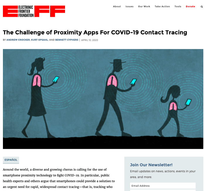 Cyphers, Bennett, et al. “The Challenge of Proximity Apps For COVID-19 Contact Tracing.” Electronic Frontier Foundation, 10 Apr. 2020. www.eff.org, https://www.eff.org/deeplinks/2020/04/challenge-proximity-apps-covid-19-contact-tracing.