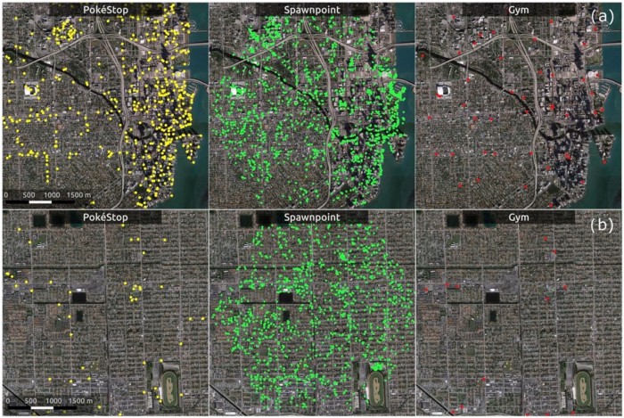 In 2017, Juhász and Hartwig conducted a geographic analysis of Pokémon GO locations, demonstrating a lack of PokéStops (yellow dots) and Gyms (red dots) in disadvantaged neighbourhoods, effectively restricting gameplay for residents (pictured above). The map compares metropolitan Downtown Miami (a) and Hialeah, a closeby municipality with a significantly higher Hispanic population (b) (Juhász and Hartwig, 2017).