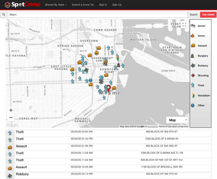 SpotCrime is a “public facing crime map and crime alert service” that draws police agencies and validated sources, and also allows for users to submit a crime tip. (SpotCrime)