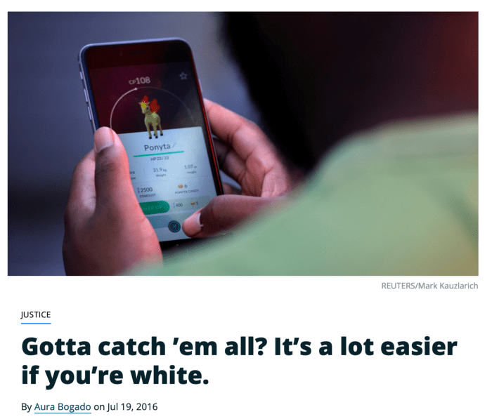 Bogado, Aura. “Gotta Catch ’em All? It’s a Lot Easier If You’re White.” Grist, 19 July 2016, https://grist.org/justice/gotta-catch-em-all-its-a-lot-easier-if-youre-white/.