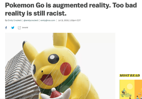 Crockett, Emily. “Pokemon Go Is Augmented Reality. Too Bad Reality Is Still Racist. — Vox.” Vox, 11 July 2016, https://www.vox.com/2016/7/11/12149664/pokemon-go-augmented-reality-racist.