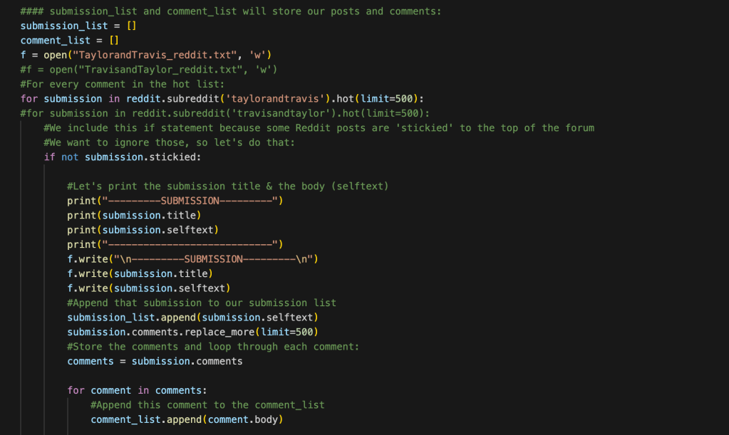 Recently, I used the skills I learned in the Python workshop to pull data I’m using for a co-written paper on social media commentary about Taylor Swift and Travis Kelce (see example code below).
