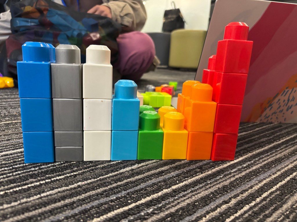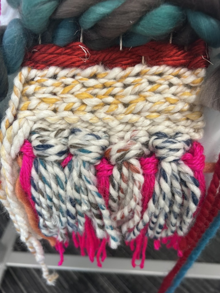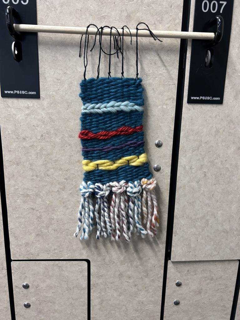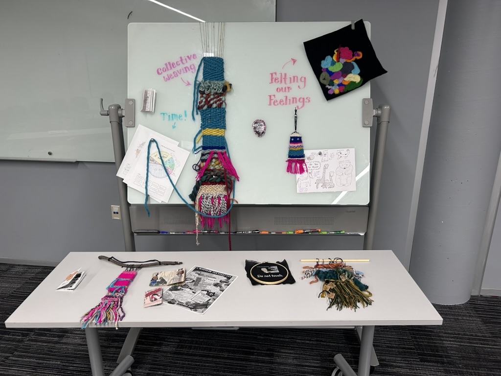 We learned how to weave using clipboards as a loom and created individuals weaves, as well as a larger collective weave using a whiteboard as a loom.