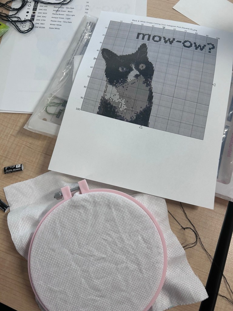 Building on the concept of a “Stitch n’ Bitch,” we made cross-stitch patterns online, printed them, and then cross-stitched while we chatted about academia, making, cats, and everything in between.