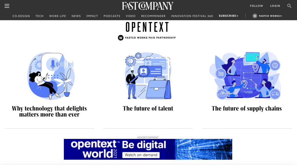 The OpenText content partnership with Fast Company is designed to promote and elevate executive thought leadership at OpenText. The 2021-2022 content partnership is structured around the theme of “Future of…” and includes executive thought leadership topics across engineering, marketing, IT, and equity, diversity, and inclusion.